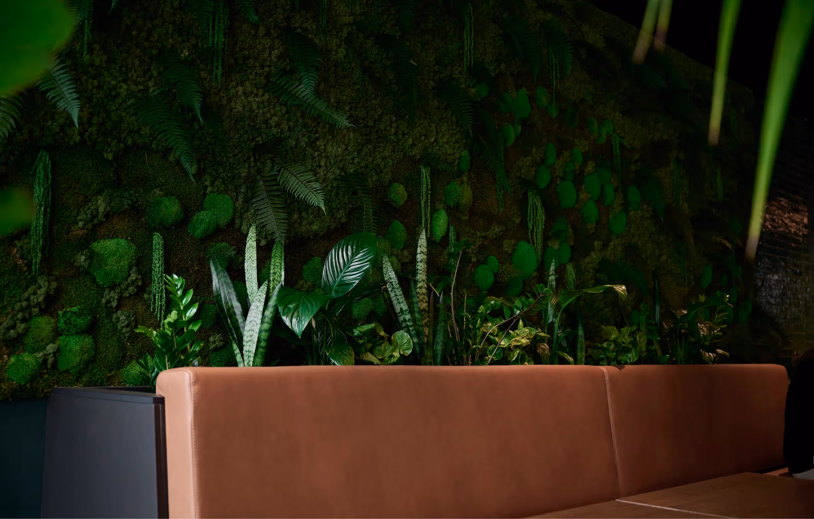 Outside In applied biophilic design principles to ensure the many planted elements are not only aesthetically pleasing – they also provide a restful and welcoming presence to those experiencing the space. Plant chandeliers are a unique feature that draws attention to the building’s form. Their placement invites you to take a moment to relax and gaze up towards the expansive ceiling and the plentiful natural light. Other bespoke greenery includes a handcrafted moss wall, which provides a green backdrop to integrated booth seating. Preserved ferns were inserted into this work to add density, texture and realism.