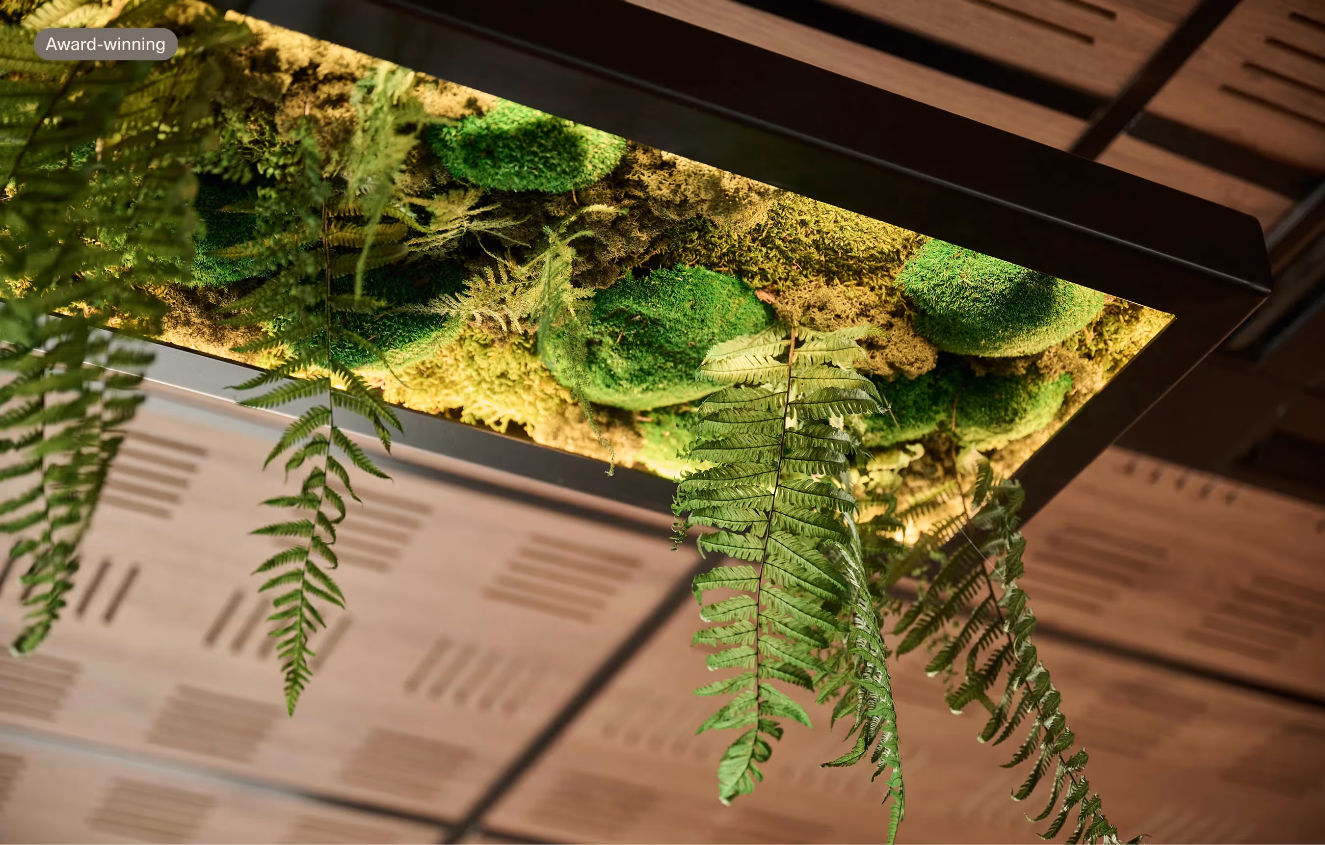 This commercial greenery is filled with bespoke details. The first custom element is a moss wall. Three types of preserved moss are layered around timber battens, creating a key focal point in the workplace. The second sees Home’s logo – a house shape – crafted entirely of reindeer moss to bring character to the stairwell. Outside In produced a third bespoke work – a custom suspended moss panel. Inset with recessed LED lighting, it responded to the client’s need to add functional lighting above the boardroom table and spans over four metres in length. Outside In also crafted aerial planting to bring warmth to the timber ceiling panels, creating a living green canopy. Freestanding planters complement the interior decor.