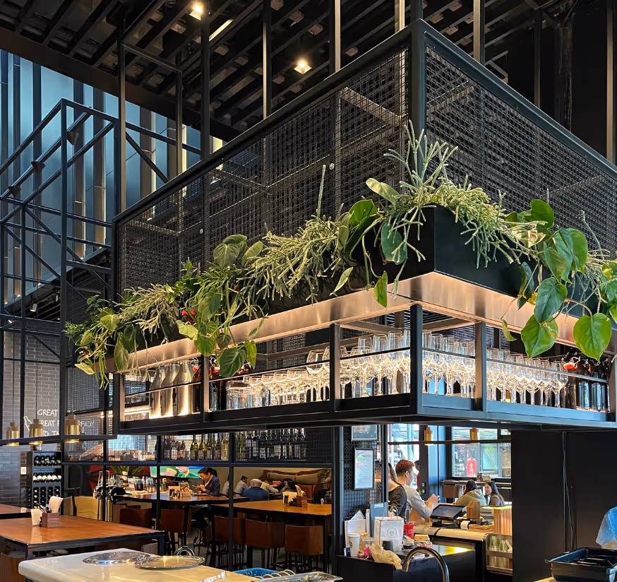 Plant species were selected to thrive in available natural light, with complex installations carefully coordinated around existing services. Hanging and wall-mounted planting enhances sightlines, softens large volumes, and creates a more intimate, welcoming experience without compromising circulation or maintenance.