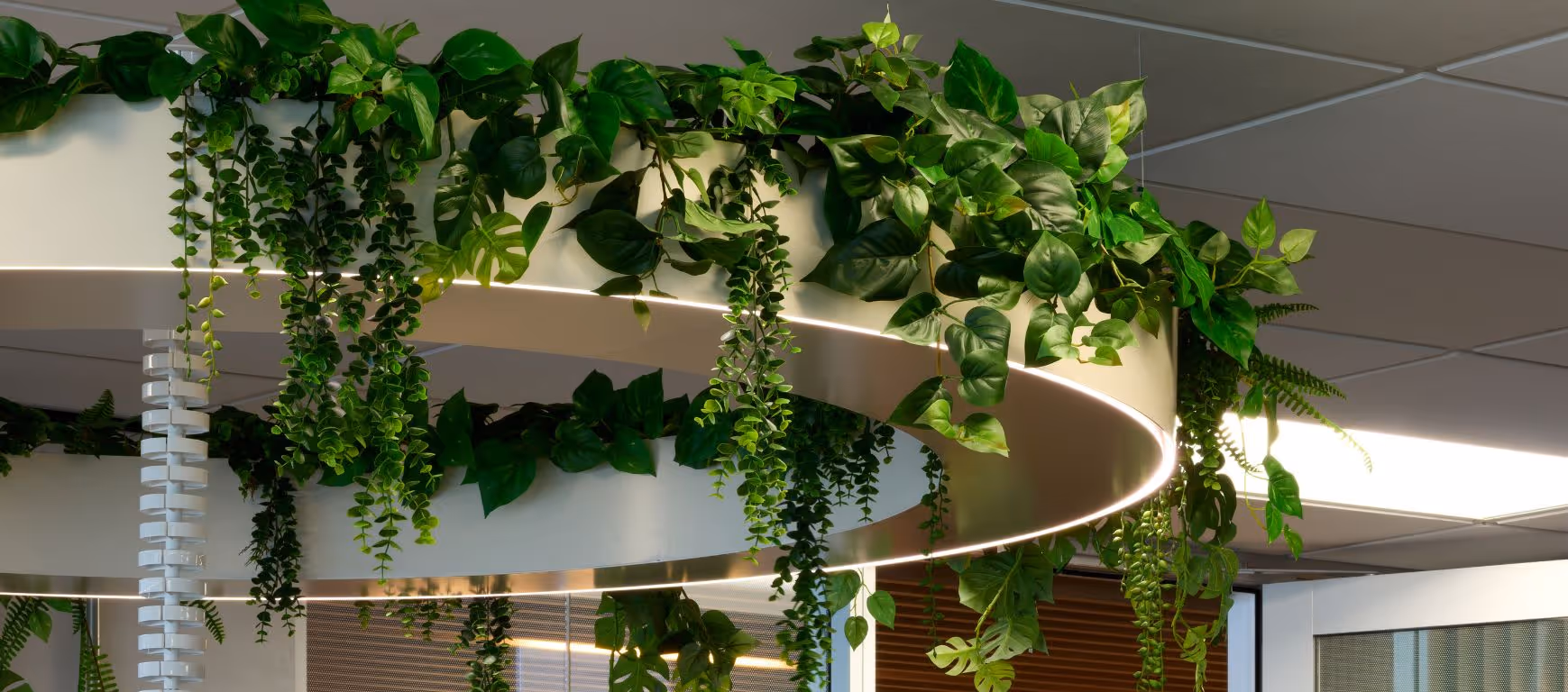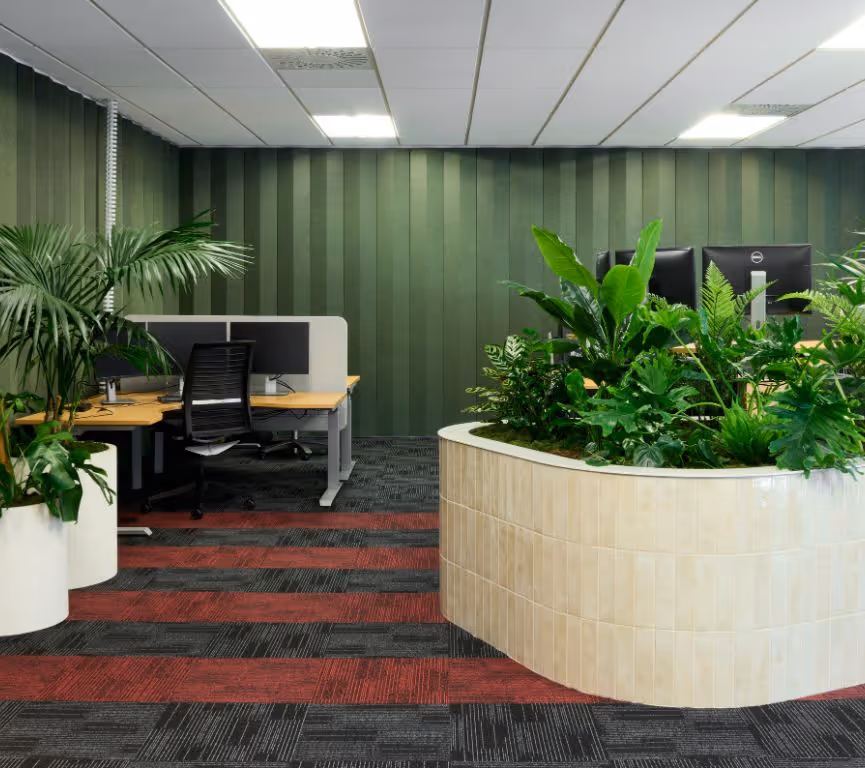 Planting was strategically placed to invite movement, define zones, and soften light while maintaining sightlines to exterior views. Every detail was refined in close collaboration with DGSE. Curved tiled planters and overhead ring planters mirror the architecture’s organic flow, integrating lighting and greenery as one cohesive design language. A handcrafted moss logo acts as a living expression of Secruitease’s creative identity and provides a distinctive focal point for visitors and staff alike.