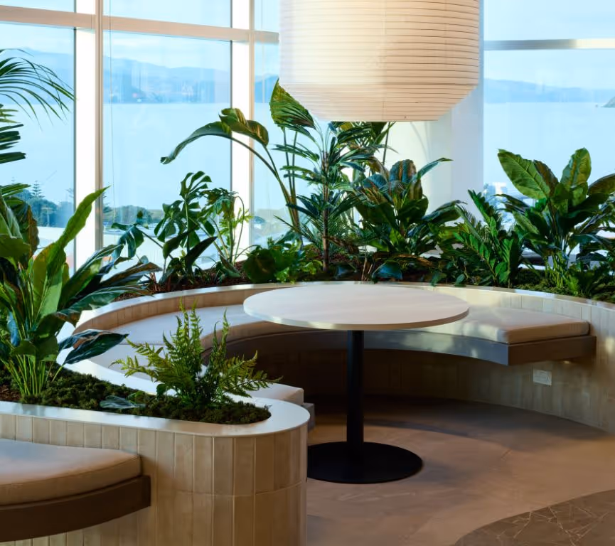 Safety, sustainability, and longevity guided every decision. To achieve a lush, enduring result, we developed a hybrid planting system combining live, preserved, and artificial species. Live plants were chosen for resilience and low water demand, while preserved and artificial greenery ensured consistent vibrancy in low-light or high-traffic areas. Together, they form a sustainable, low-maintenance environment that remains fresh year-round. The completed space demonstrates how thoughtful planting can elevate architectural intent, creating a workplace that grows with its people and truly invites the outside in.