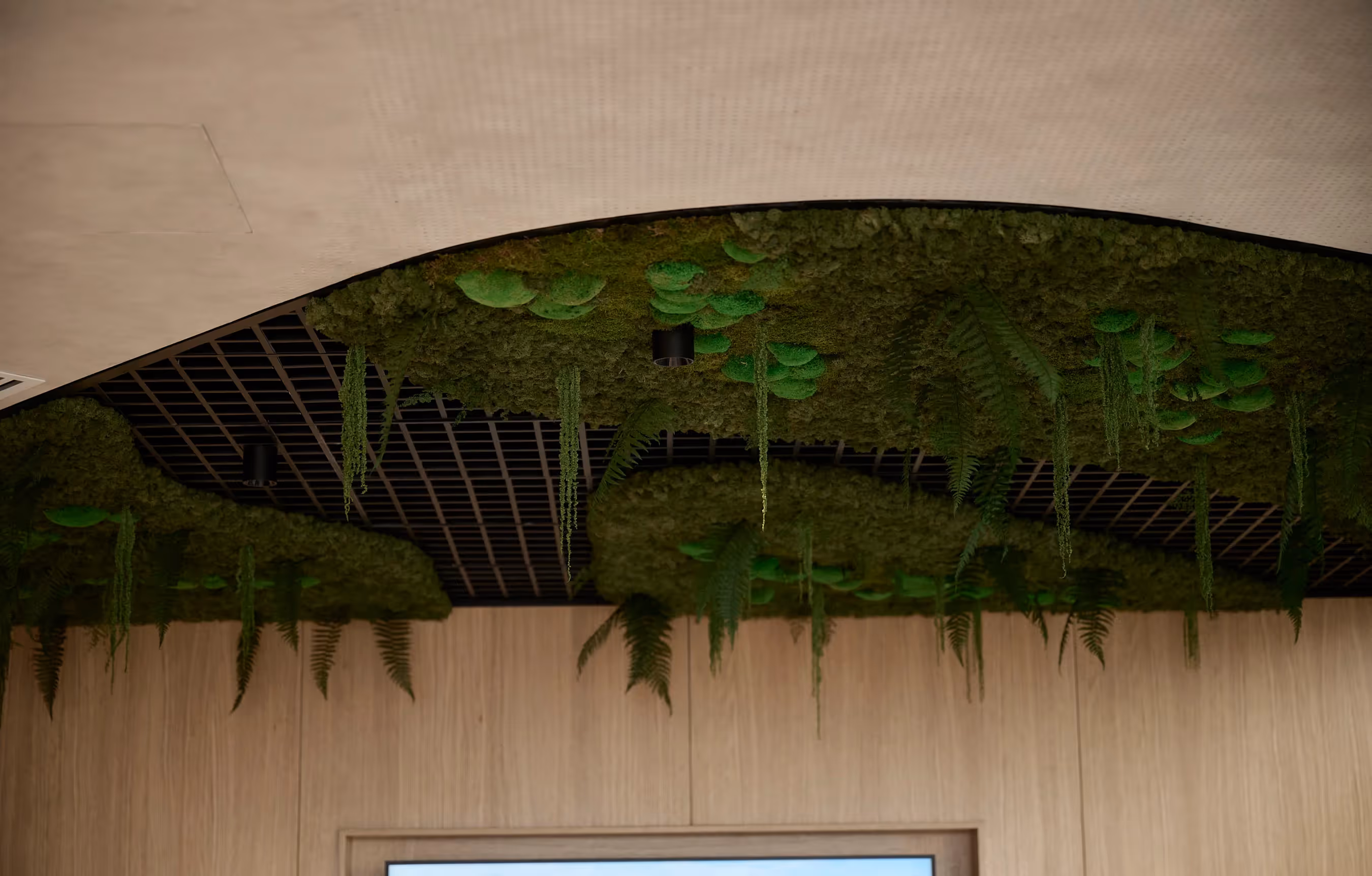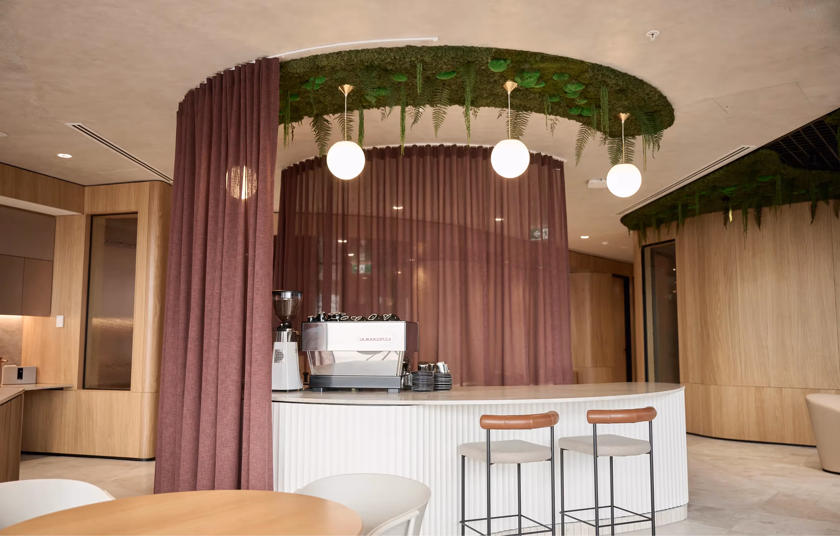 Inspiring nature is weaved across this Pōneke Wellington workspace. Four bespoke and handcrafted moss artworks inset into the ceiling create an immediate impression when entering the office. They signal the quality of the greenery that lies beyond the public areas. Planting creates a restful presence and has been expertly designed to encourage health and wellbeing. Greenery delineates the different working areas, while custom plant troughs and plant tambours add privacy and ambience. The tactility of the green spaces complements the custom fit-out and furnishings within Simpson Grierson. Our use of biophilic design makes this a place where people can thrive.